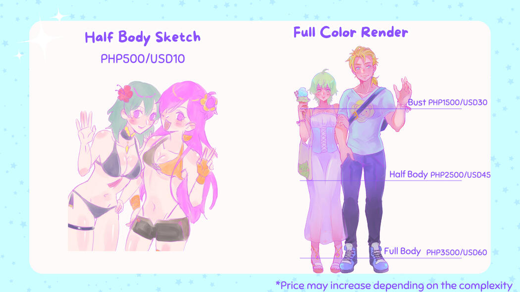If you want to commission, please send me a message along with character, posing reference pics and preferred payment method through Twitter/Tumblr /Discord~!Payment method will be through PayPal/Kofi and GCash (For PH residents).