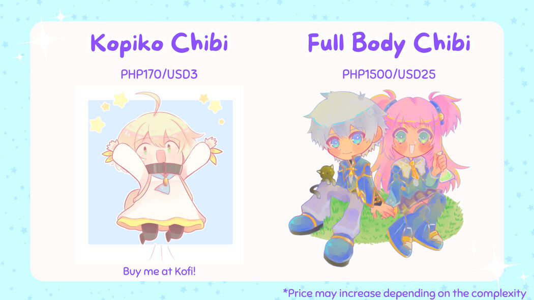 FOR KOFI CHIBI: Buy me a kopiko (coffee) at Ko-fi and state your character that you want me to draw~ I may prioritize major commissions over this. Always open. Get a Kopiko Chibi!